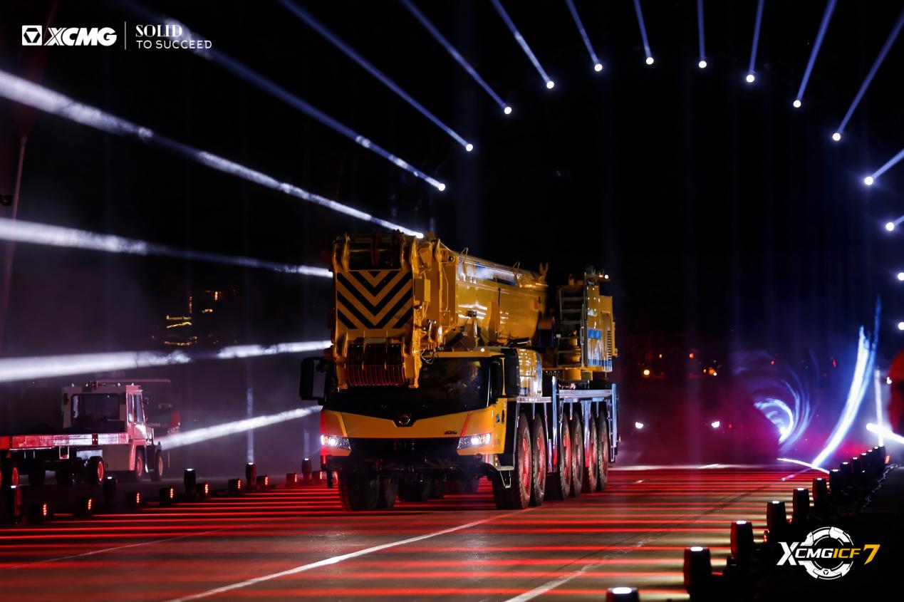 引擎轟鳴,16臺起重機列陣如虹,XCA900L8_1全地面起重機領(lǐng)銜,輪式與履帶產(chǎn)品組成“鋼鐵艦隊”。車隊駛過觀禮臺,客商們紛紛舉起手機定格畫面,客商高呼:“Amazing!”鳴笛聲中,設(shè)備駛向全球,燈光在夜幕中匯成“時光隧道,照亮遠征之路。