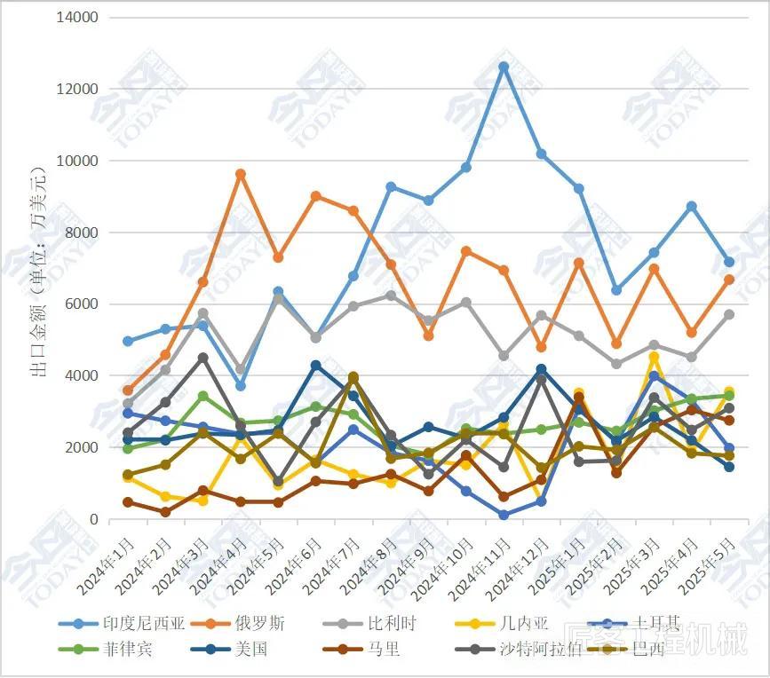 從2025年1—5月主要工程機械產品進出口貿易情況來看,對俄羅斯、美國、印度尼西亞出口金額排名位列前三,其次為沙特阿拉伯、巴西、印度、巴西、阿聯酋、澳大利亞、日本、越南。相較2025年1—4月的排名,印度上升進入前五,巴西下降至第六。