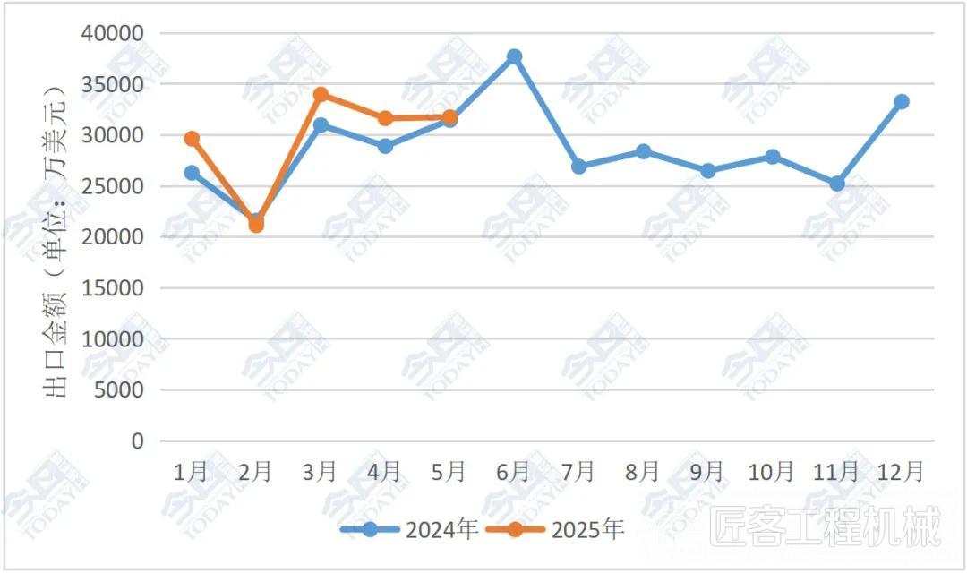 2025年5月較2024年同期的7.02億美元同比增長26.57%。2025年1—5月我國挖掘機累計出口總額為40.01億美元,相較于2024年同期的32.58億美元,增長22.81%;增速較2025年1—4月增長1.1個百分點。我國挖掘機出口月度走勢具體情況如圖2所示。
