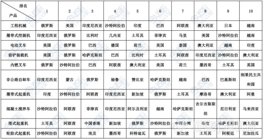 表1  2025年1-5月主要工程機械產品出口金額排名前十位國家和地區