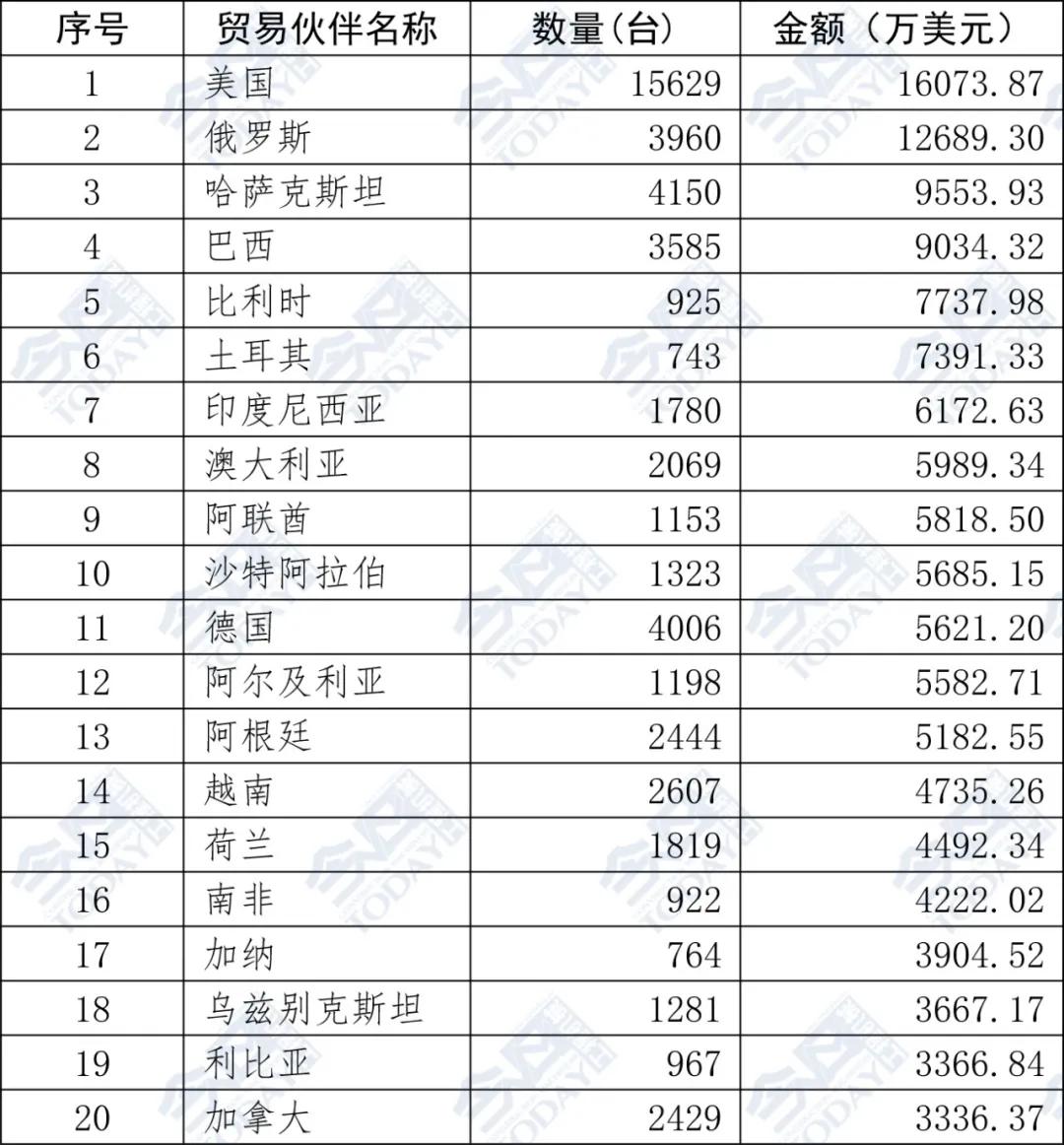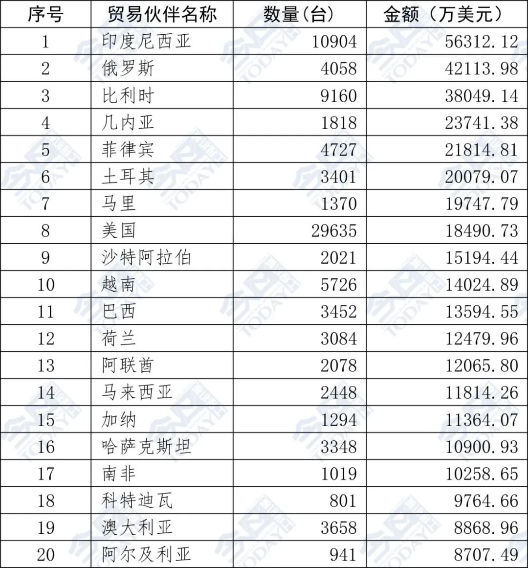 表2  2025年1—7月挖掘機出口額排名前二十位國家和地區