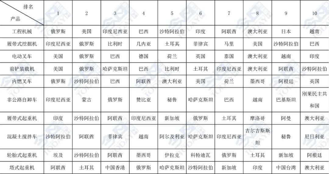 表1  2025年1-7月主要工程機械產品出口金額排名前十位國家和地區