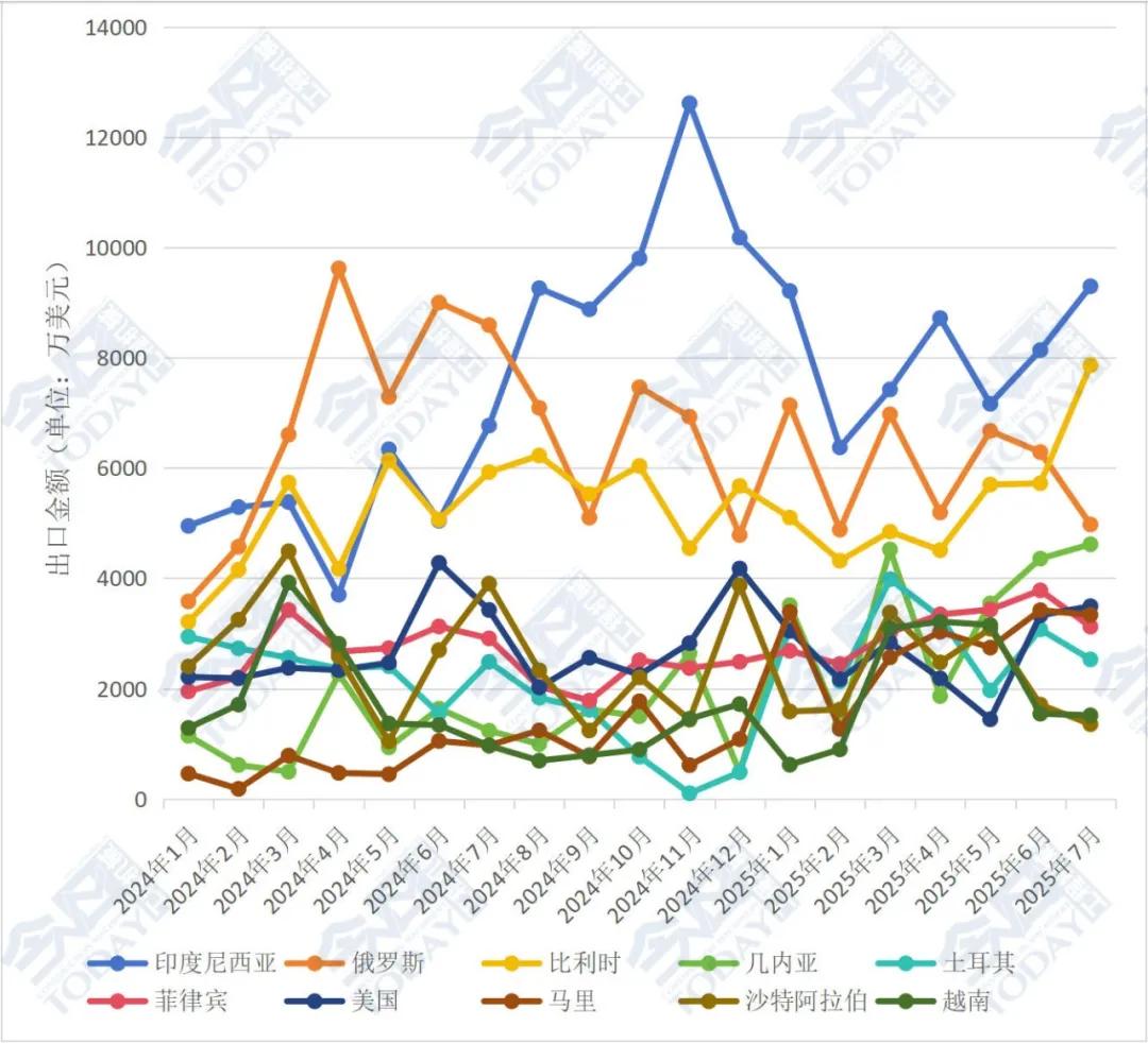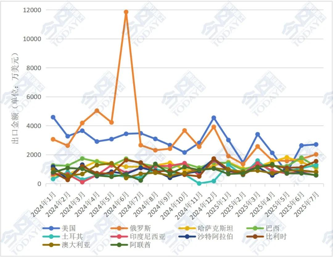 對歐洲地區出口額情況,俄羅斯下降明顯,比利時環比大增37.41%。2025年7月我國挖掘機對俄羅斯出口額為4974.02萬美元,較2025年6月的6287.69萬美元下降20.90%,2025年1—7月我國挖掘機對俄羅斯累計出口額42113.98萬美元,較去年同期49242萬美元同比下降14.48%;2025年7月我國挖掘機對比利時出口額達7860.88萬美元,較2025年6月的5721.10萬美元上升37.41%,2025年1—7月我國挖掘機對比利時累計出口額38049.14萬美元,較去年同期34393萬美元同比上升10.63%。
